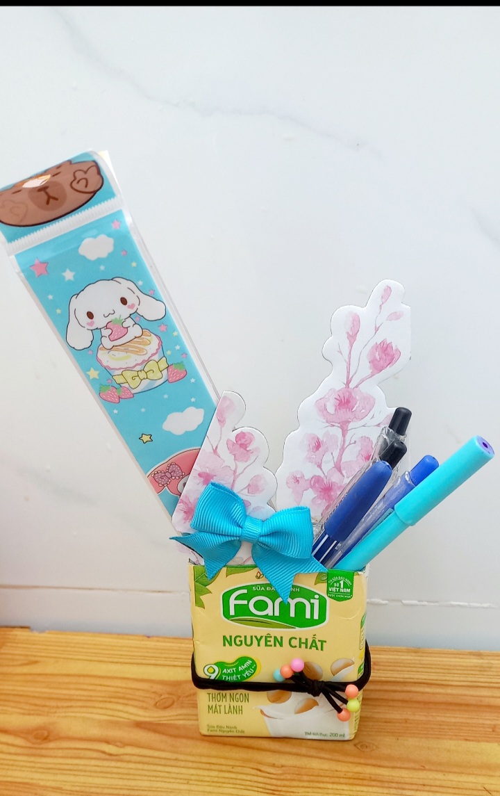 Sau khi uống hết hộp sữa, con không vứt đi mà giữ lại để làm đồ tái chế. Con thử cắt và dán các hộp sữa lại với nhau rồi trang trí thêm màu sắc để làm giỏ đựng đồ dùng. Khi hoàn thành, con dùng để đựng bút và những món đồ nhỏ trên bàn học. Con thấy rất vui vì vừa có đồ hữu ích vừa giúp giảm rác thải. 🌱📦🧺✨