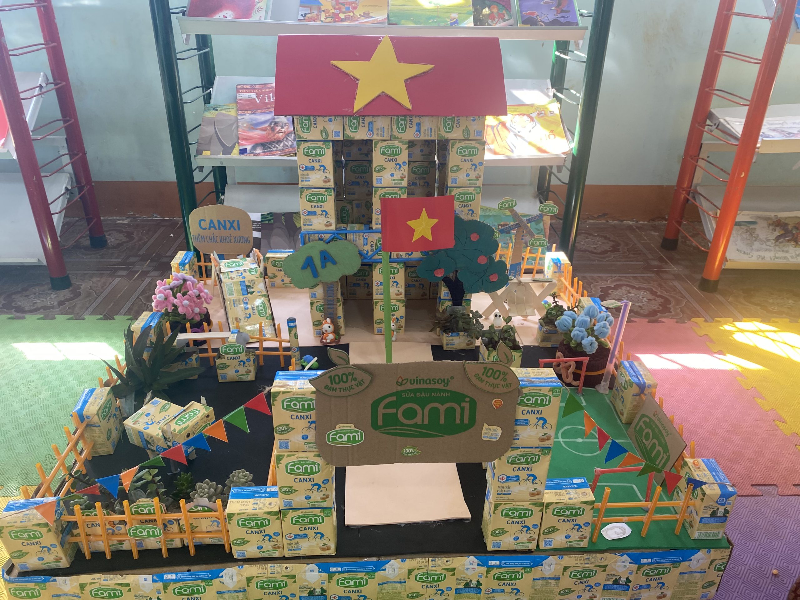 Mô hình được xây dựng như một “ngôi trường thân thiện” thu nhỏ, sử dụng các hộp sữa đậu nành Fami làm vật liệu chính. Hình ảnh lá cờ Việt Nam, sân chơi, cây xanh và lớp học thể hiện môi trường học tập lành mạnh, gắn liền với dinh dưỡng và sự phát triển toàn diện của trẻ em.