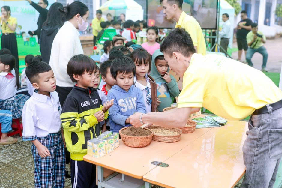 Tại Quảng Ngãi, những buổi sinh hoạt ngoại khóa đã biến sân trường thành không gian tràn ngập tiếng cười và niềm háo hức của các em nhỏ. Các trạm thử thách về dinh dưỡng và môi trường mang đến những giây phút vừa vui nhộn vừa giàu tính giáo dục. Mỗi câu hỏi, mỗi thử thách như một “hạt giống” được gieo vào tâm hồn trẻ thơ, khơi gợi cảm hứng sáng tạo và tình yêu đối với môi trường sống. Các em còn được tham gia những hoạt động đầy thú vị như phân loại rác và tái chế vỏ hộp sữa thành chậu cây đậu nành nhỏ xinh. Qua đôi bàn tay chăm chút từng mầm cây, các em hiểu hơn về nguồn gốc của mỗi hộp sữa và ý nghĩa của việc tái sử dụng, bước đầu hình thành thói quen ý thức về bảo vệ môi trường.