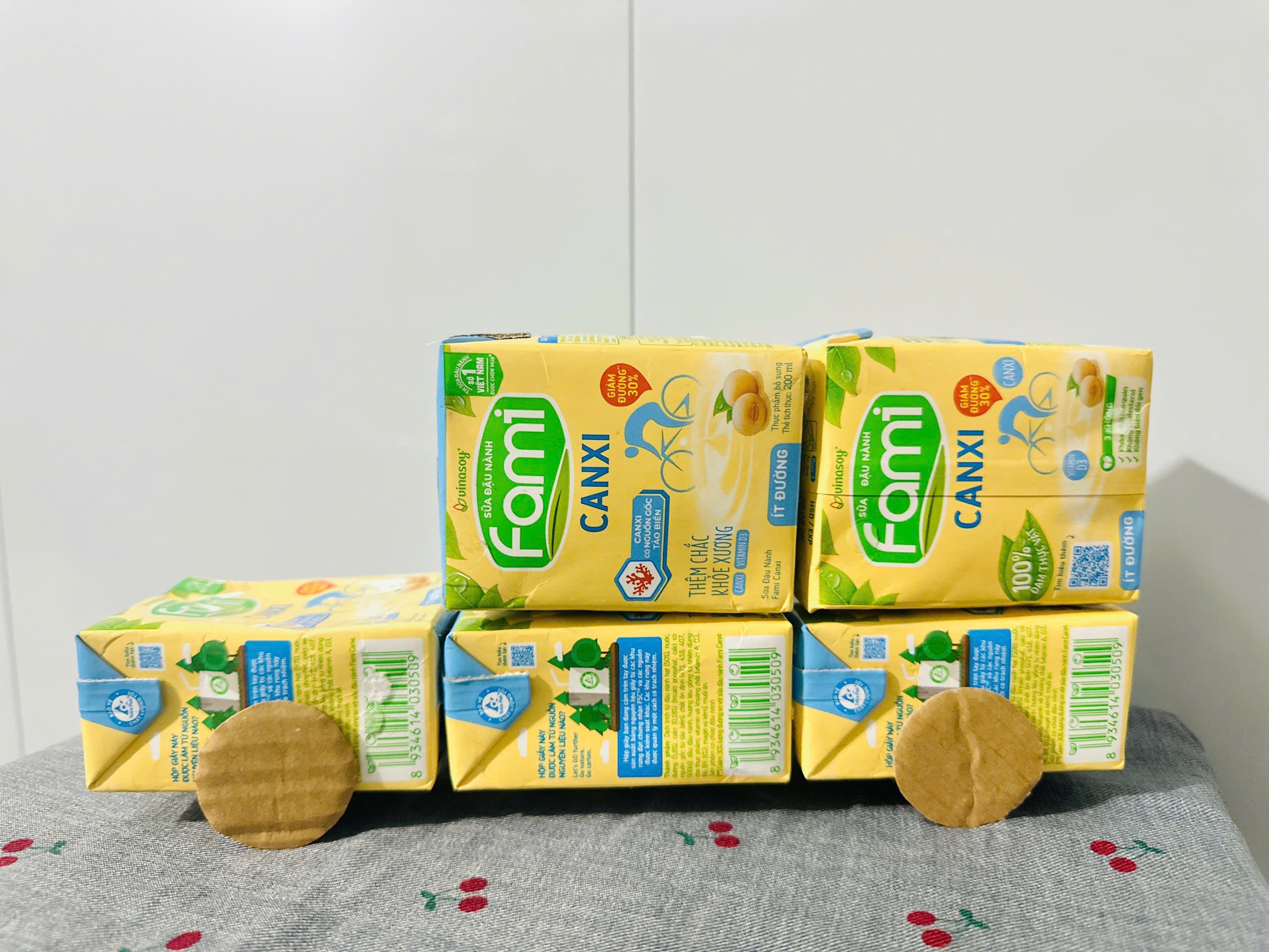 Tụi con cùng nhau sáng tạo, chế tạo lại những vỏ hộp sữa đã dùng thành mô hình xe tải chờ hàng. Mỗi bạn phụ trách một công đoạn như cắt, dán, gắn bánh xe nên ai cũng được tham gia. Trong quá trình làm, tụi con học cách tỉ mỉ, kiên nhẫn và hợp tác với nhau. Mô hình tuy đơn giản nhưng mang lại niềm vui và giúp tụi con hiểu rằng tái chế vừa thú vị vừa góp phần bảo vệ môi trường. 🚚🌱