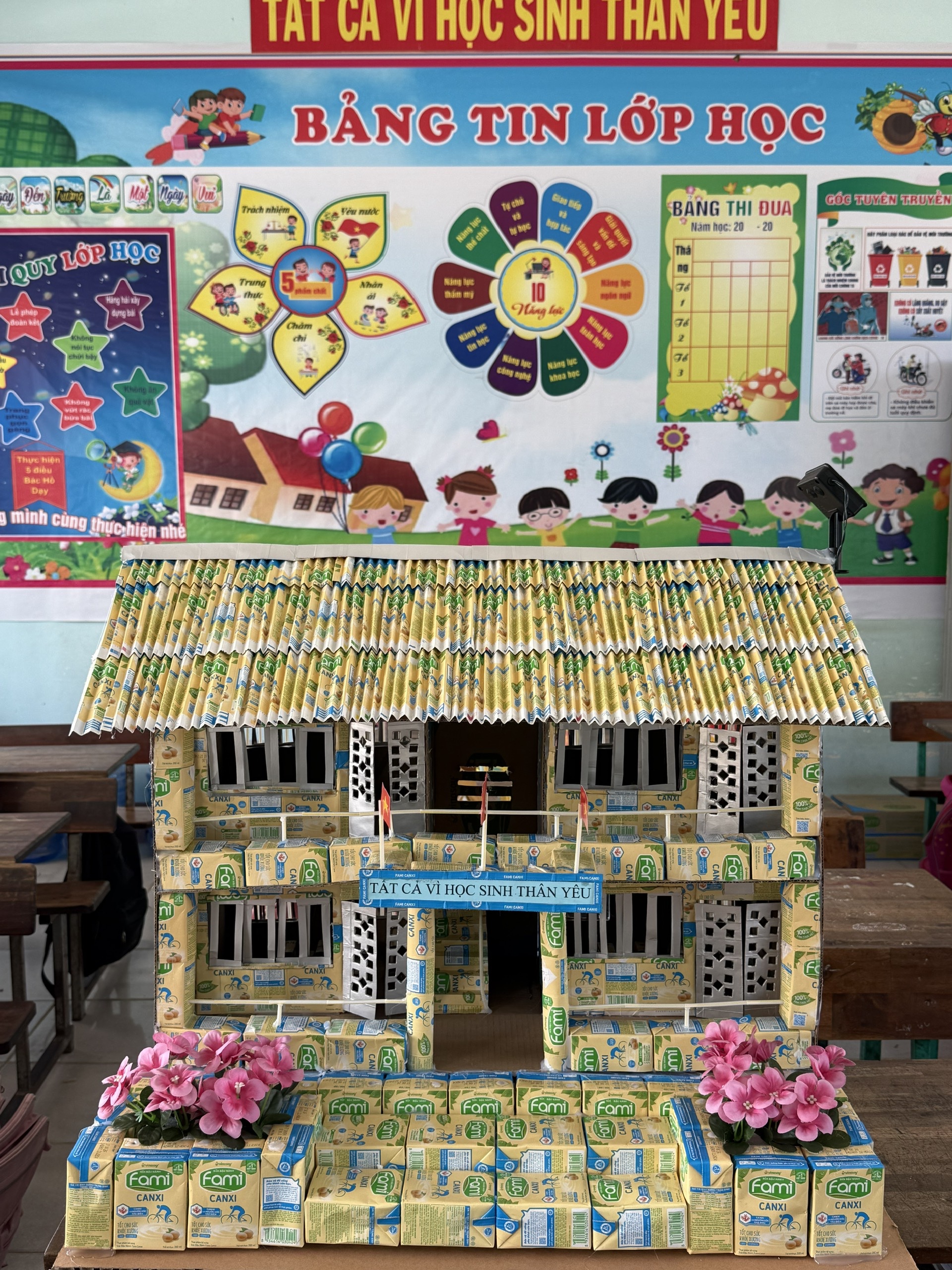Đây là một mô hình ngôi trường tiểu học được làm hoàn toàn từ các hộp sữa Vinasoy đã qua sử dụng, thể hiện sự sáng tạo và ý thức bảo vệ môi trường.