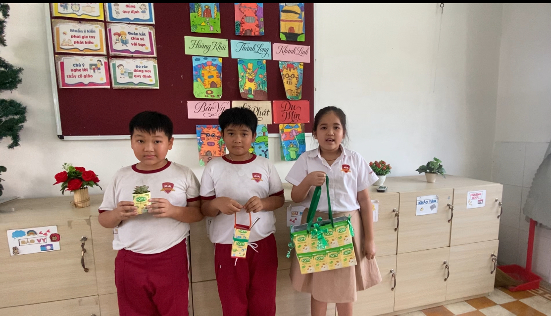 Nhóm 3 bạn đã sử dụng vỏ hộp sữa fami để tạo ra đồ đựng muỗng đũa, chậu trồng cây kiểng, túi xách