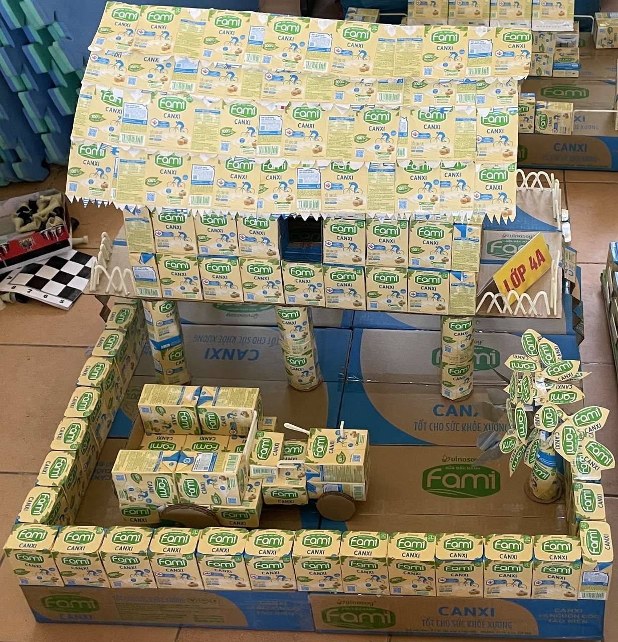 Đây là mô hình **nhà sàn làm từ hộp sữa Fami tái chế**. Mái, tường và cột nhà đều được xếp từ các hộp sữa, tạo hình chắc chắn và gọn gàng. Xung quanh có hàng rào và xe mô hình, làm tăng tính sinh động.