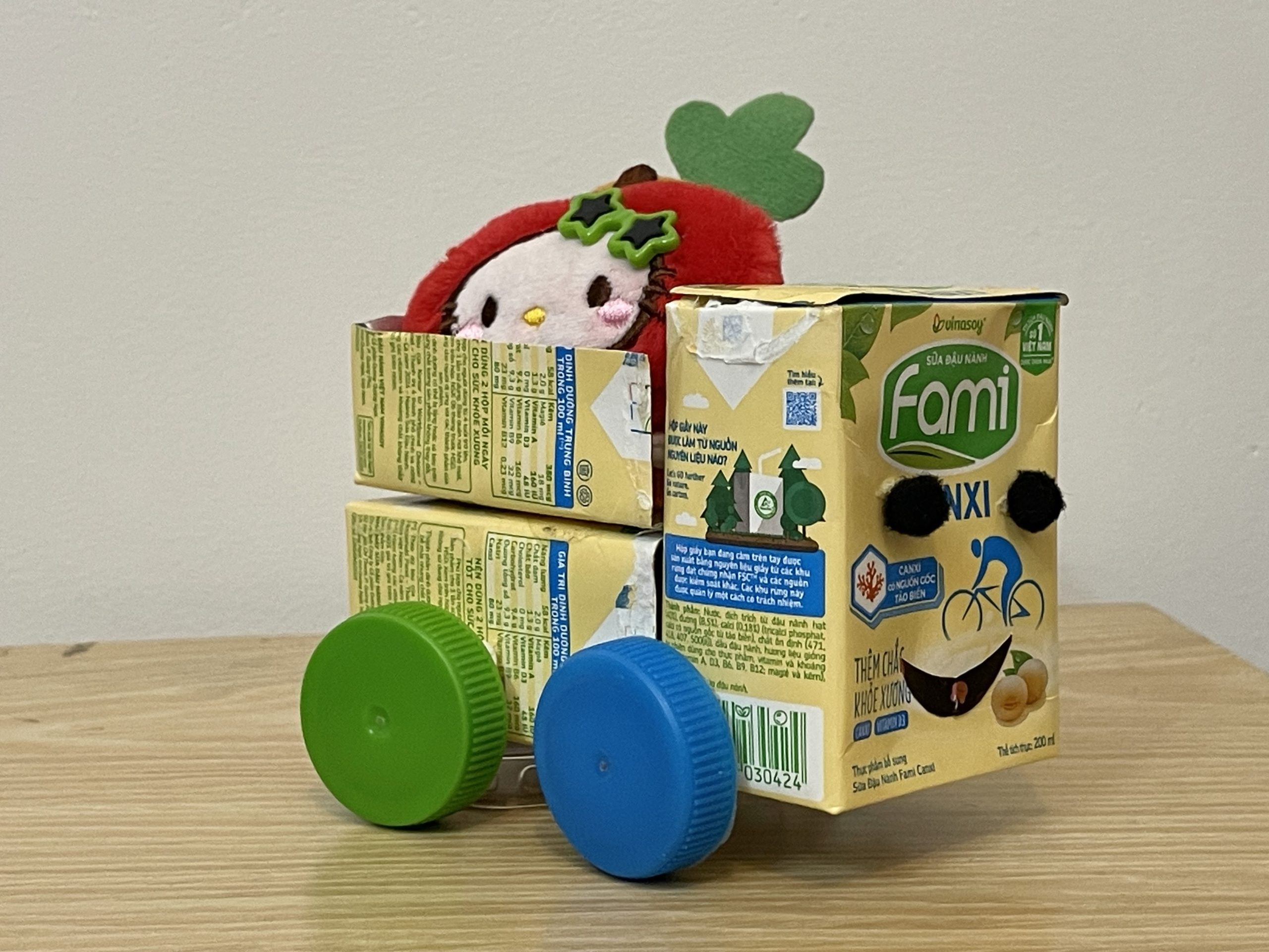 Tuần trước con có tiết thủ công cô giáo cho con xem nhiều mẫu các anh chị tái chế đồ vật đẹp ơi là đẹp. Con thử lấy hộp sữa ở nhà mày mò làm theo, thành phẩm là một chiếc xe để trang trí tại bàn học mặc dù không đẹp bằng của các anh chị nhưng mà con vui lắm vì tự tay mình làm được. Con cũng rủ các bạn khác làm theo vừa vui mà còn giúp cho môi trường ít rác thải