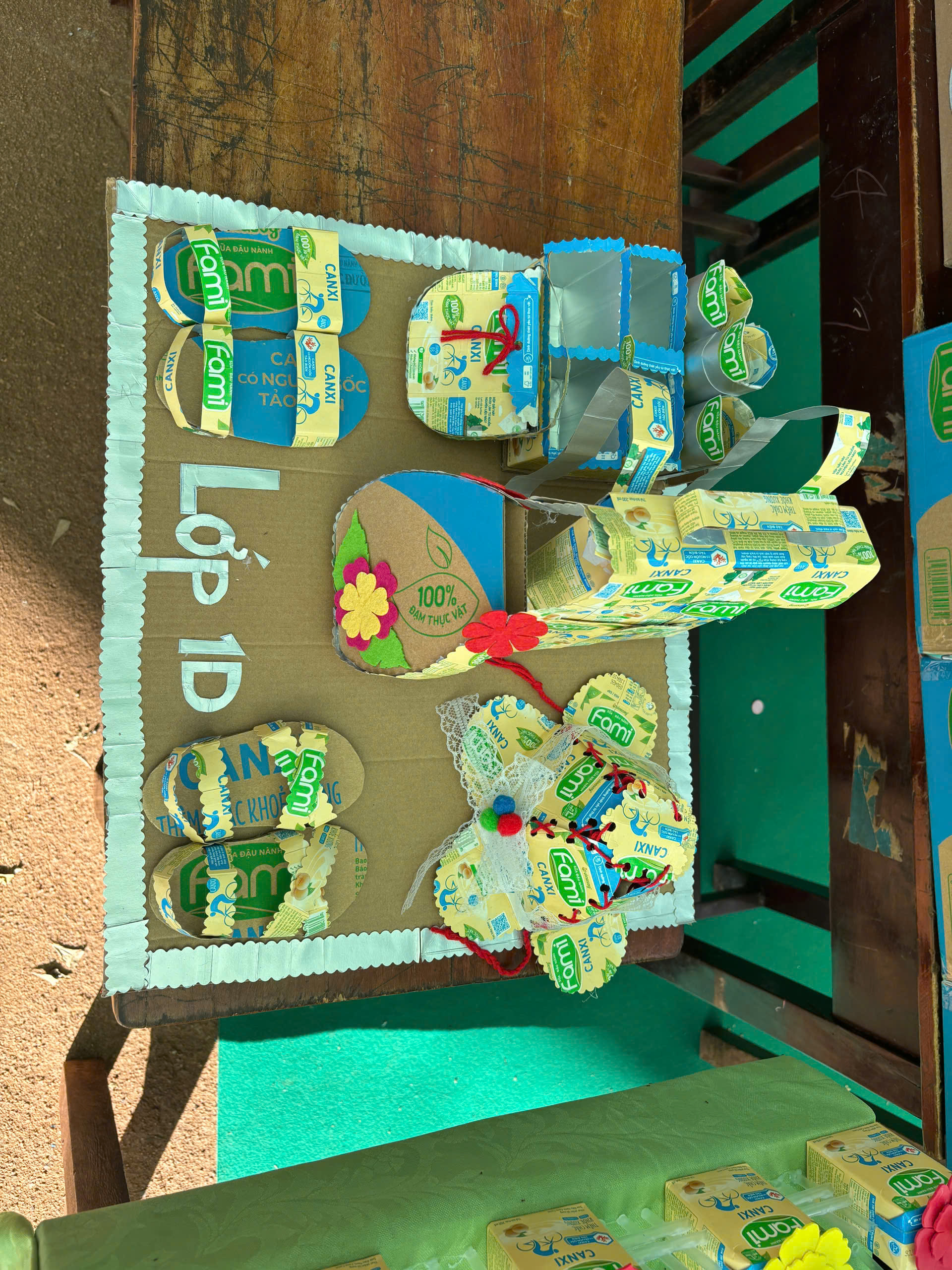 Thời trang tái chế đang là xu hướng của thế giới và nhóm chúng em trường Tiểu học Kim Đồng muốn theo kịp xu hướng đó ngay từ khi còn nhỏ qua mô hình Đồng Phục Tái Chế. Chúng em nghiên cứu về thời trang bền vững trước khi bắt đầu, sau đó lên ý tưởng thiết kế bộ đồng phục học sinh từ vỏ hộp sữa Vinasoy. Quy trình làm giống hệt may vá thật: phác thảo mẫu, cắt vải (bìa), ghép lại và hoàn thiện chi tiết. Bộ đồng phục hoàn thiện gồm áo, quần, giày và mũ, tất cả đều từ vỏ hộp sữa. Màu sắc trắng và xanh của đồng phục được giữ nguyên từ màu vỏ hộp sữa Vinasoy, tạo sự hài hòa tự nhiên. Đây là bằng chứng rằng môi trường và thẩm mỹ có thể đi đôi với nhau một cách hoàn hảo.