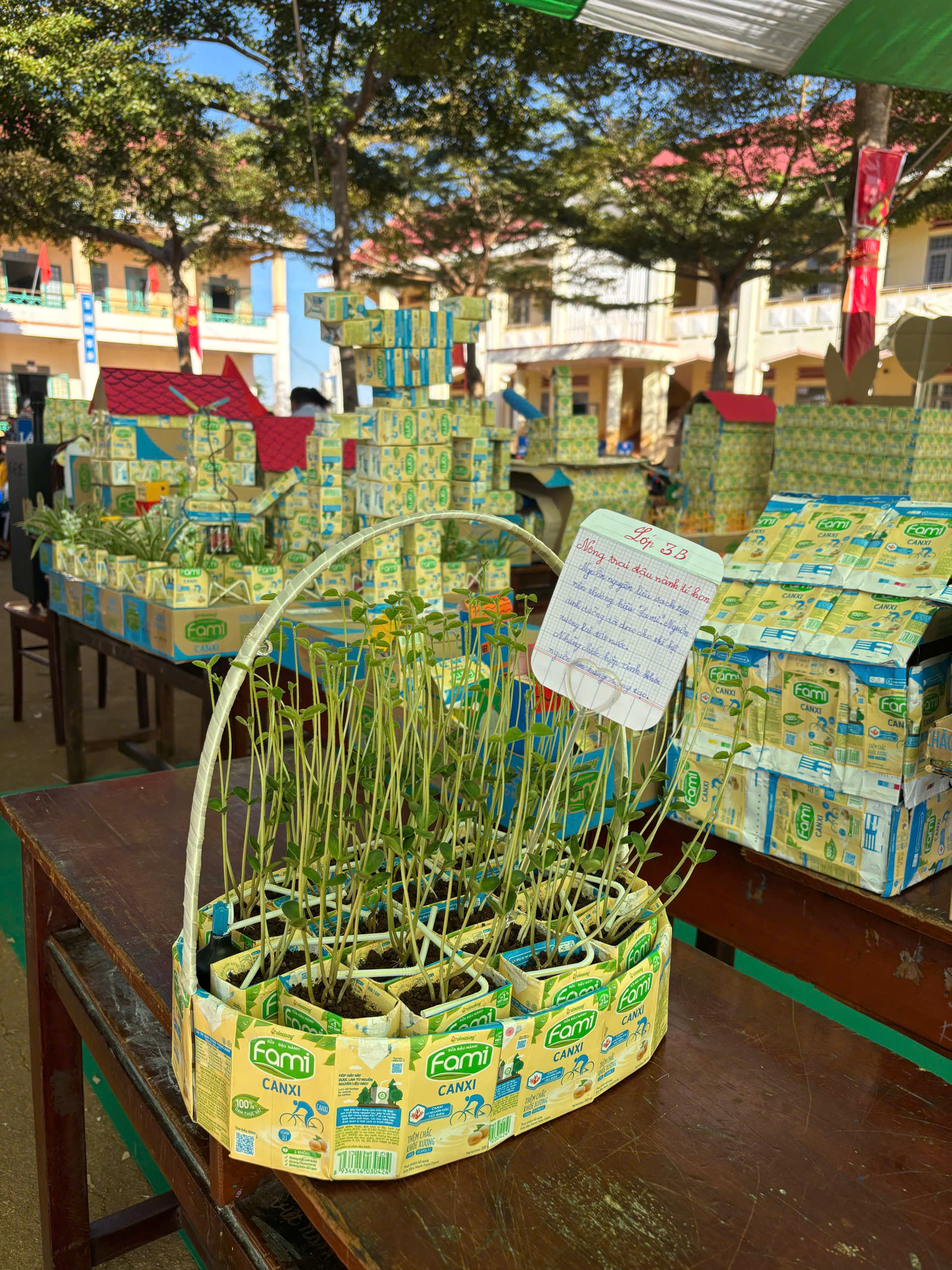 Từ đâu mà có những hộp sữa đậu nành Vinasoy thơm ngon? Câu hỏi ấy đã dẫn dắt nhóm chúng em trường Tiểu học Kim Đồng tạo nên mô hình Nông Trại Đậu Nành Tí Hon đầy sống động. Từ những vỏ hộp sữa được tái chế, chúng em dựng lên cả một nông trại thu nhỏ: ruộng đậu nành xanh tươi với từng hàng cây thẳng tắp, nhà kho chứa hạt, trạm bơm nước và xe máy cày mini. Những cây đậu nành được làm từ dây kẽm uốn và giấy xanh cắt tỉa công phu. Mô hình giúp chúng em hiểu được công sức của người nông dân, hành trình từ hạt giống đến hộp sữa thơm ngon. Đây là lời tri ân của chúng em gửi đến những bàn tay nông dân cần cù và thiên nhiên màu mỡ đã cho chúng em ly sữa bổ dưỡng mỗi ngày.