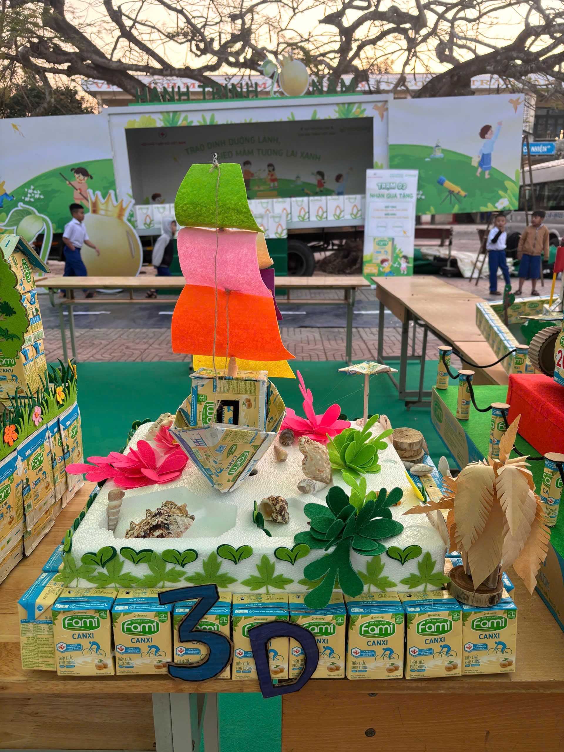 Suốt những ngày tham gia cuộc thi, các em học sinh Trường Tiểu học Tân Long miệt mài ngồi cắt, dán, tạo hình từ những vỏ hộp sữa thu gom được. Thành quả của sự kiên trì ấy chính là mô hình “Thuyền” — tác phẩm mang đậm dấu ấn sáng tạo của tuổi học trò.