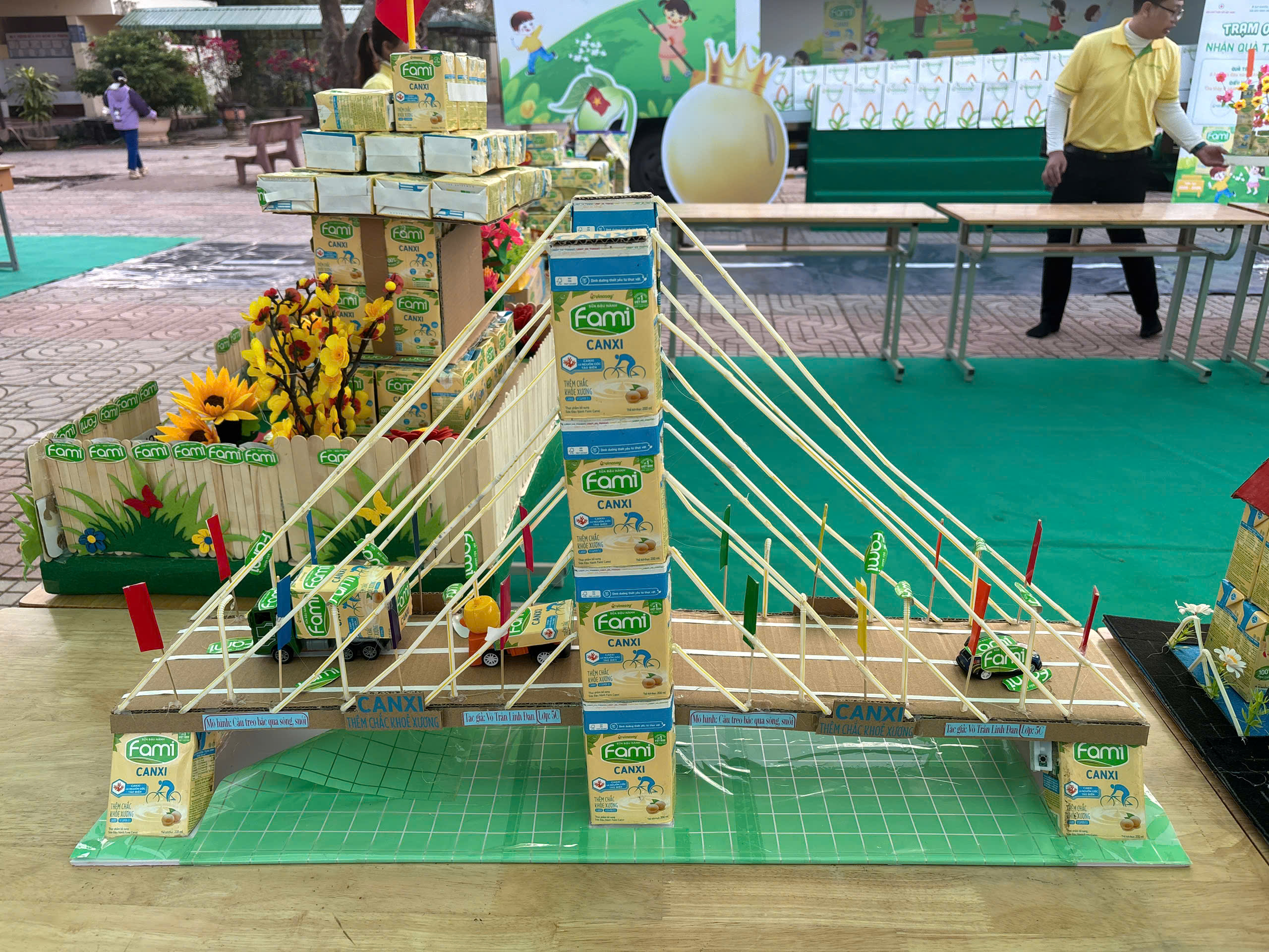 Các em học sinh Trường Tiểu học Tân Long đã tự tay gom từng chiếc vỏ hộp sữa, tỉ mỉ cắt, dán và ghép lại để tạo nên mô hình “Cây Cầu Treo” — tác phẩm mang dấu ấn của chính đôi tay nhỏ bé và trí tưởng tượng không giới hạn của tuổi thơ.
