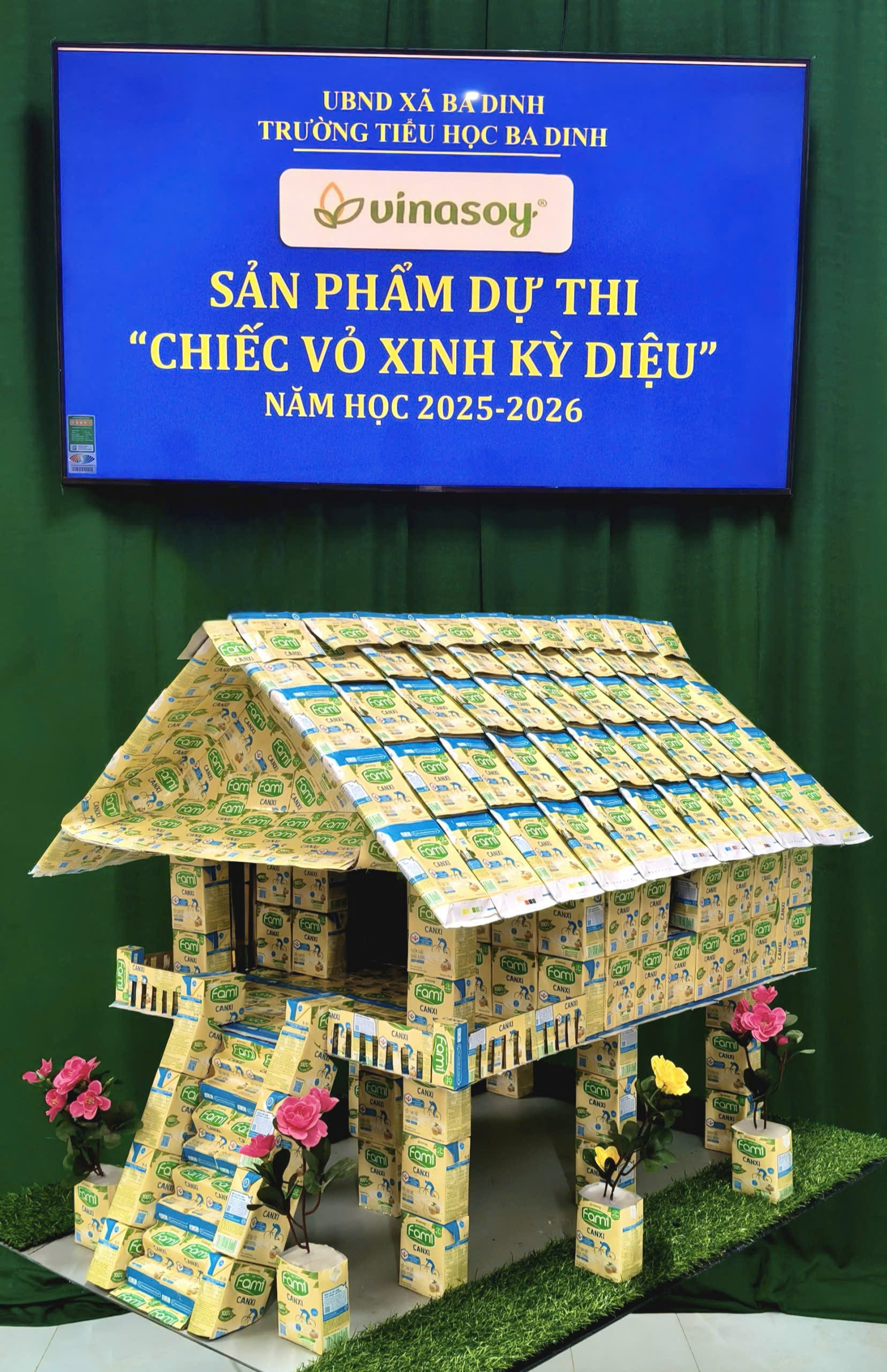 Mô hình nhà sàn của người dân tộc H’re được sáng tạo từ những vỏ hộp sữa và thùng sữa đậu nành Fami Canxi đã qua sử dụng.